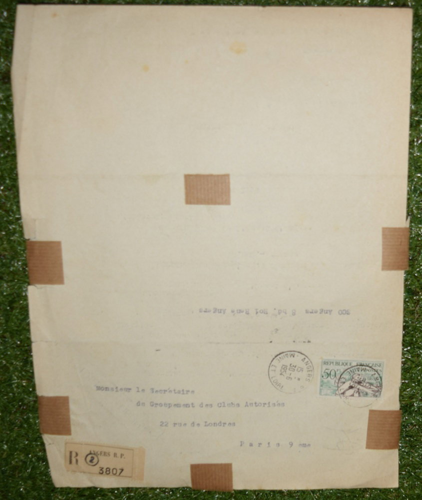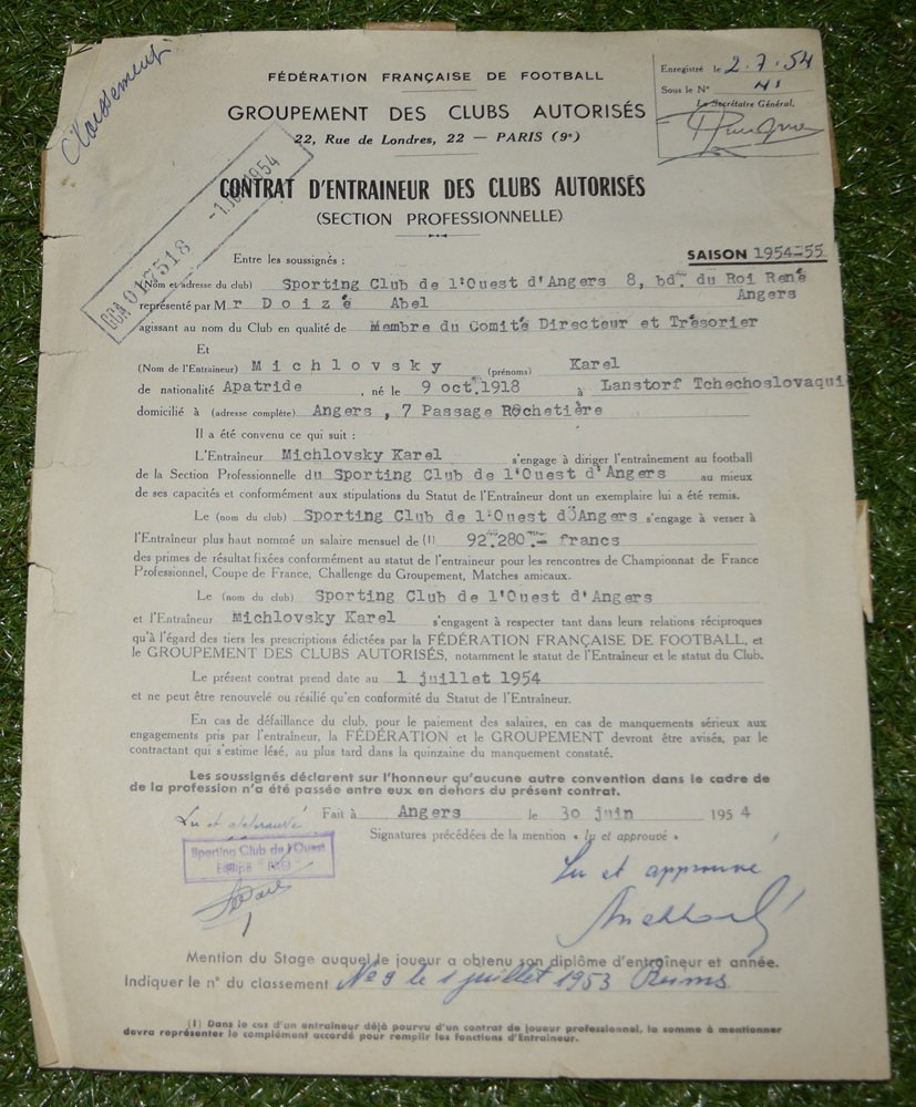 Contrat d'Entraineur-Joueur Professionnel de Karel Michlovski signé le 27 aout 1951 de l'AS St Etienne vers le SCO d'Angers. Document très rare que j'ai eu l'opportunité d'obtenir avec le montant des salaires et primes versé en francs !